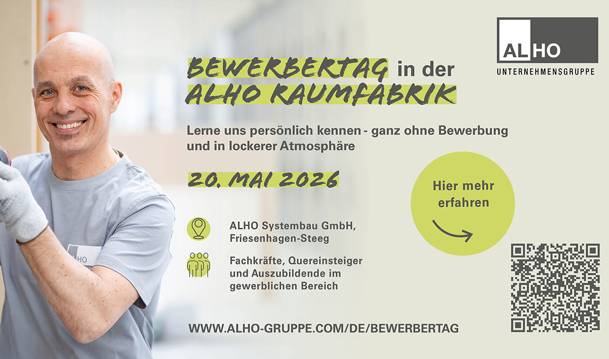 Seit über 60 Jahren entwickelt und fertigt ALHO das Gebäude der Zukunft – nachhaltig, effizient und mit echter Leidenschaft fürs Bauen. Der Bewerbertag bietet die ideale Gelegenheit, dieses Umfeld live zu erleben.