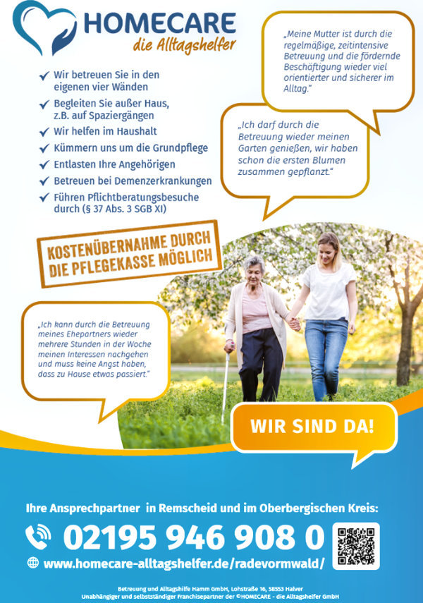 HOMECARE – die Alltagshelfer, ein neues Betreuungskonzept für Senioren und Familien im Oberbergischen Kreis und Remscheid