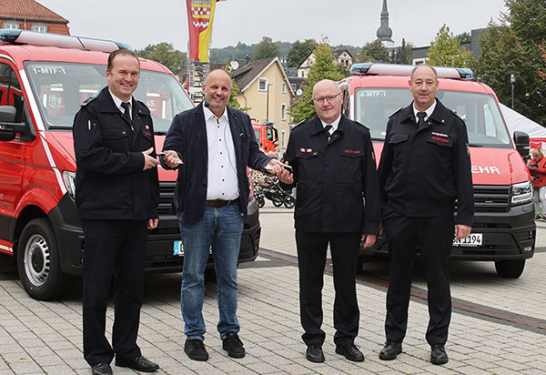 Die Präsentationen der Feuerwehr und die Übergabe zweier Mannschaftstransportfahrzeuge im Wert von jeweils 114.000 Euro waren eingebettet in die Veranstaltung „Nyestädter Herbst“. Stephan Hatzig, Leiter des Löschzuges IV, Andreas Carduck, Leiter des Löschzuges I, Feuerwehrchef Stricker sowie Bürgermeister Matthias Thul freuten sich sehr, dass die modern ausgerüsteten Fahrzeuge nun genutzt werden können. Dank Politik und Verwaltung seien die Mittel innerhalb eines Jahres, statt der sonst üblichen zwei Jahre, freigestellt worden, berichtete Stricker.