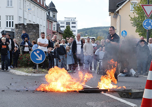 „Bitte kommen Sie schnell! In meinem Wohnzimmer brennt es!“ Der abgesetzte Notruf erklang laut über den Lautsprecher am Marktplatz in Bergneustadt. Hunderte Besucher verfolgten die Simulation eines Zimmerbrandes, dessen Feuer im Hintergrund gut sichtbar und durch die extreme Hitze hautnah spürbar war. Auch das Anrücken des Löschzuges und die Löschaktion beeindruckte die vielen Erwachsenen und Kinder.