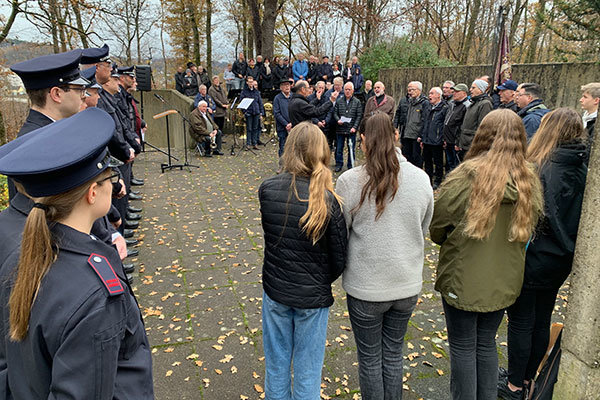 Bei der Gedenkfeier des örtlichen Heimatvereins am Ehrenmal traf laut einer Mitteilung Alt auf Jung. Es sang der Männerchor und es spielte der Posaunenchor, Schülerinnen und Schüler der TOB-Sekundarschule Bielstein verlasen zudem Briefe aus alter und neuer Zeit, in denen die seelische Not in Kriegszeiten beschrieben und die Hoffnung auf Frieden bekundet werden, um die Texte dann in einen selbstgebauten „Briefkasten der Erinnerung“ einzulegen. Anschließend sangen die jungen Leute, begleitet von ihrem Lehrer auf der Ukulele, das Friedenslied Hevenu shalom alechem - jede Strophe in einer anderen Sprache. Dies führte zu spontanem Applaus bei den zahlreichen Anwesenden. Zuvor sprachen Pfarrer i. R. Daniel Boltner und Sören Teichmann, Erster Stellvertretender Bürgermeister der Stadt Wiehl.