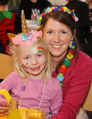 [Liebevoll kostümiert und bunt geschminkt: Mutter und Tochter genießen gemeinsam den Kinderkarneval in Belmicke.]