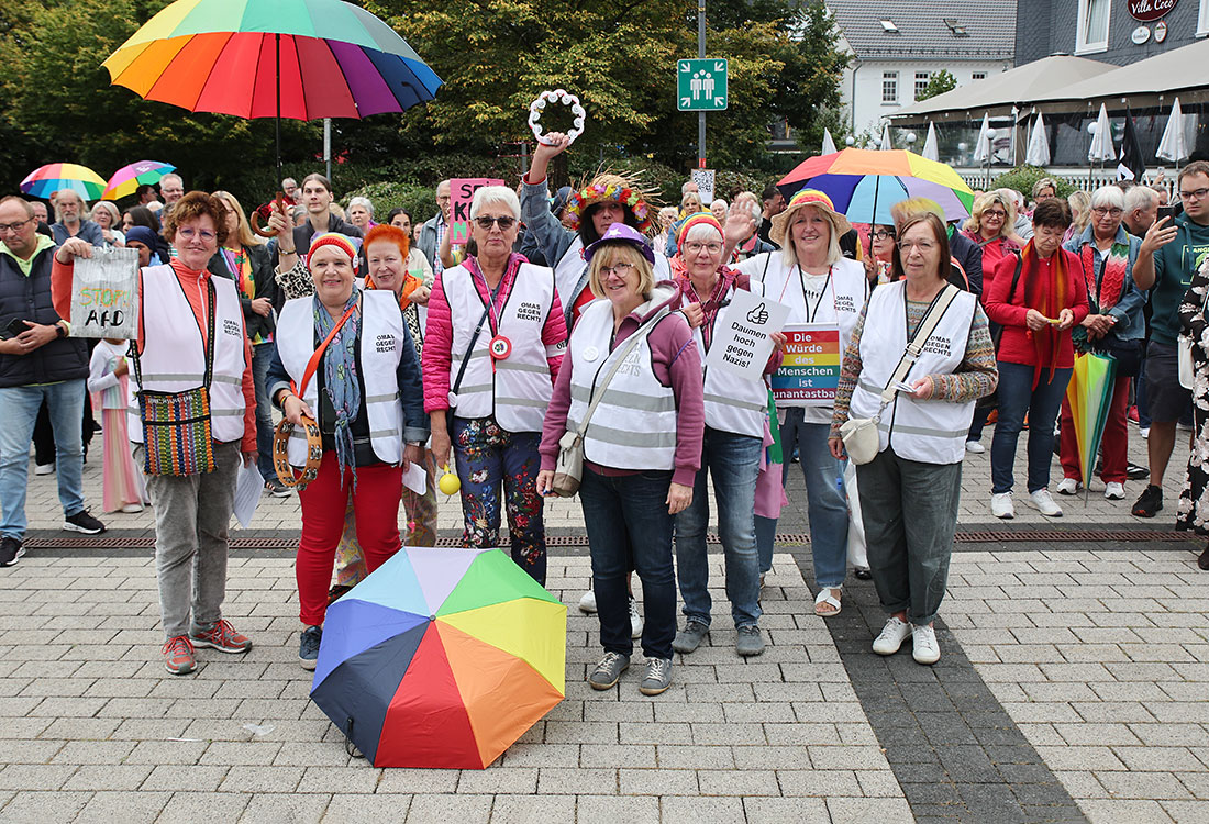 Unter dem Motto „Farbe bekennen! Mutig und klar gegen Hass. Lügen und rechte Hetze“ wollten die Veranstalter ein „deutliches Zeichen für Menschlichkeit, Demokratie und Toleranz in Bergneustadt“ setzen. Da die rund 220 Teilnehmer, aus Politik, Kirchen, Kultur und Vereinen der Einladung zur Demo in farbenfroher Kleidung, mit Plakaten, Trillerpfeifen, Glocken und bunten Regenschirmen nachgekommen waren, wurde dem Wunsch der Organisatoren optisch, akustisch und inhaltlich volle Rechnung getragen.