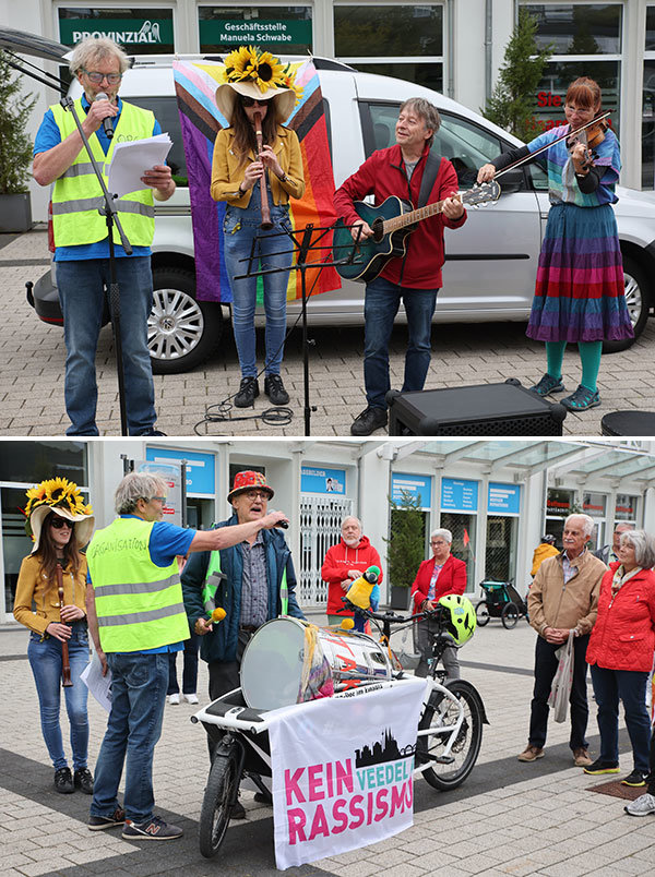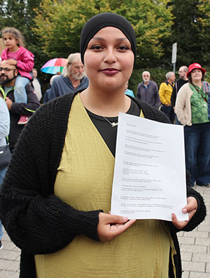 Als Vorstandsmitglied von „Unser Oberberg ist bunt, nicht braun“ warnte Ute Rademacher vor dem Abdriften demokratischer Parteien an den rechten Rand, um dort Wählerstimmen zu requirieren. Ebenso gebe der Blick auf die Weltpolitik Anlass zur Besorgnis, so dass hier und jetzt der Zeitpunkt gekommen sei, der AfD entschieden entgegenzutreten. In ihrem sehr persönlichen Rap-Poem „Wacht endlich auf“, der mit dem Jugendkulturpreis 2024 ausgezeichnet wurde, warb Beyza Sönmez für Toleranz und ein friedliches Zusammenleben aller Kulturen, einem Appell, dem sich die „Omas gegen Rechts“ mit Meinungsäußerung und „Oma-Lied“ anschlossen.