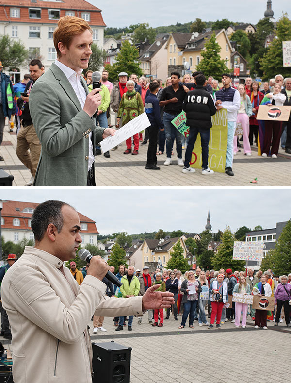 Bergneustadt - Zu einem öffentlichen Statement gegen den Faschismus versammelte sich gestern Bergneustadts Stadtgesellschaft auf dem Rathausplatz - Im Krawinkelsaal warb die AfD um Stimmen für die Kommunalwahl.