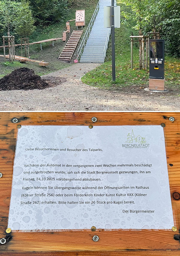 Die Einnahmen aus dem Kugelverkauf kommen dem Förderkreis Kinder, Kunst & Kultur (KKK) zugute. Bis eine sichere Lösung gefunden ist, erfolgt der Kugelverkauf vorübergehend über die Zentrale im Rathaus sowie über den Förderkreis. Gleichzeitig werden Gespräche über einen alternativen und vor allem geschützten Stellplatz für den Automaten geführt, heißt es aus dem Rathaus, das trotz der Zwischenfälle von einem großen Gewinn für den Talpark spricht.