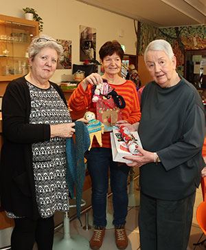 [Angelika Wessendorf (v.li.) und Doris Klaka von den Strickfrauen mit Ina Albowitz.]