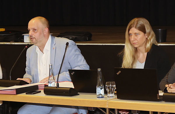 [Foto: Michael Kleinjung ---- Keine angenehmen Zahlen hatten Bürgermeister Matthias Thul (li.) und Kämmerin Janina Hortmann zu verkünden.]