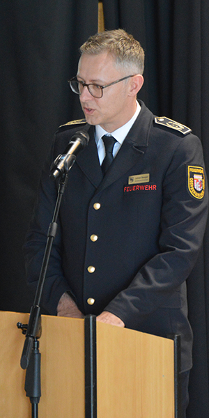 Gerards bezog sich laut einem Medienbericht auf eine Position im städtischen Haushalt. Dort sind 380.000 Euro für den Ausbau des Parkplatzes am Feuerwehrgerätehaus Dieringhausen veranschlagt. Konrads setzte die Kosten demnach mit denen eines Einfamilienhauses gleich und kritisierte den Nutzen. Zwar ruderte der Fraktionschef noch im Ausschuss zurück und wollte seine Aussagen missverstanden wissen, den Unmut von Politik und Bürgermeister hatte er sich da aber bereits zugezogen. Auch Kreisbrandmeister Julian Seeger (Foto) sagte in seinem Grußwort, dass er sich „einen Seitenhieb“ erlauben dürfe: „Wenn man sich die Zusammenhänge von Feuerwehreinsätzen und posttraumatischen Folge ansieht, hat das gar nichts mit Spielplatz zu tun!“