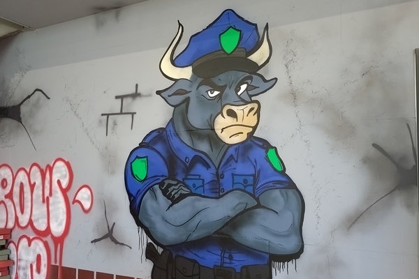 [Bei einem Rundgang über das Gelände. Oben: die befahrbare Halle, in der Verkehrskontrollen geübt werden. Unten: eines von zahlreichen Graffitis, die im Bereich der Kneipe zu sehen sind.]