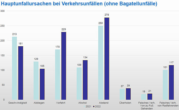 An der Spitze behauptet hat sich der fehlende Abstand (von 250 auf 278). „Der schnelle Blick auf das Handy kann je nach Geschwindigkeit schon locker eine Strecke von 50 bis 100 Metern ausmachen“, erklärte Greb. „Das können wir so nicht laufen lassen“, sagte Hagt und kündigte noch schärfere Kontrollen an. Was Ablenkung betrifft, war die Zahl der Kontrollmaßnahmen im vergangenen Jahr gesunken. Gestiegen sind sie bei Geschwindigkeitskontrollen, gerade außerorts. Erhöhte Geschwindigkeit war dann auch etwas seltener Unfallursache (von 213 auf 181).