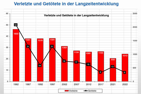 Hagt betonte mit Blick auf die Zunahme, dass man von Rekordzahlen komme, die vor allem durch mehr Home-Office-Nutzung und weniger Freizeitangeboten profitierten. Dass die Zahlen noch moderat gestiegen sind, macht er auch daran fest, dass die generelle Home-Office-Quote gestiegen ist. Während er damit zufrieden sei, dass die Zahl der Toten wieder gesunken ist, ist Hagt von dem überproportionalen Anstieg von 20 Prozent bei den Verunglückten (von 863 auf 1.032) nicht begeistert. In diesem Zusammenhang schauten Hagt und Greb auf einige Trends und klassische Probleme auf den Straßen im Kreis: