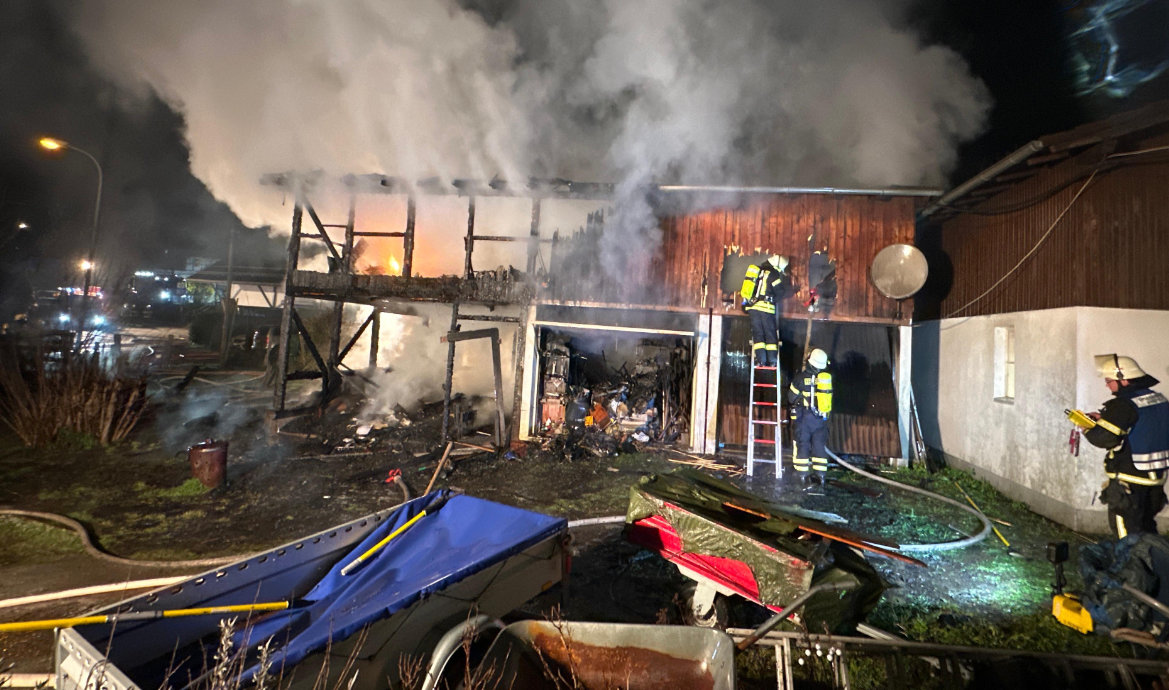 Wie Feuerwehrsprecher Hans-Peter Scheurer berichtet, waren die ersten Kräfte um 1:03 Uhr wegen eines unklaren Feuerscheins alarmiert worden. Beim Eintreffen stellte sich schnell das Ausmaß des Feuers dar, weshalb sofort Einheiten – darunter auch die Drehleiter – nachalarmiert wurden. Diese kam zum Einsatz, um mit einer sogenannten Riegelstellung ein Übergreifen der Flammen auf das direkt angrenzende Einfamilienhaus zu verhindern, was laut Scheurer auch gelang. Das Hauptgebäude bleibt bewohnbar. Die scheunenähnlich ausgebaute Garage wurde von den beiden Bewohnern als Lagerraum genutzt, die vielen Kleinteile erschwerten die Löscharbeiten. Erst nach Stunden gelang es den Einsatzkräften, mittels eines Schaumteppichs auch das letzte Glutnest zu ersticken.Erst gegen 8 Uhr am Morgen war der Einsatz beendet, die Garage wurde völlig zerstört. Verletzt wurde niemand. Die Polizei hat die Ermittlungen zur Brandursache aufgenommen.