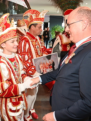 Wie bereits in den Vorjahren wurden die Kinder darauf vorbereitet, dass vom bloßen Händeschütteln über Small Talk bis zur Ordensverleihung alles möglich sei. Wie sich kurz darauf zeigte, hatte eine weitere Gesellschaft eine Audienz, denn das Dreigestirn der Karnevalsgesellschaft Ahrweiler stand ebenfalls im Foyer und sorgte so für leichte Verwirrung bei den jungen Oberbergern. Doch schnell war für Klarheit gesorgt und untereinander wurden Orden und Sticker getauscht. Mit Kinderprinzessin Helena und ihrer Adjutantin Lucie war auch der jecke Nachwuchs aus Ahrweiler vertreten, so dass erste Gruppenbilder entstehen konnten.