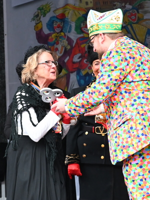 Auch in Engelskirchen war es mit Lukas Miebach ein neuer Rathauschef, der versuchte, sich mit seinen in allen Farben gekleideten Regenbogen-Mitarbeitern dem Andrang der Jecken beim Sturm auf das Rathaus entgegenzusetzen. Allen voran waren es, wie schon viele Jahre zuvor, wieder die "Ahle Möhnen" unter Führung von Elisabeth Crombach, die als Erste das Absperrband zum Festplatz hinter dem Rathaus mittels Nagelschere durchbrachen und jubelnd zu Karnevalsklängen auf die Bühne zogen. Miebach hatte dabei stets die Uhr im Blick gehabt, bis es kurz nach 11:11 Uhr um ihn geschehen war. Im Schlepptau der Möhnen hatten sich die Tollitäten aus Engelskirchen und Ründeroth mit ihren Gefolgen eingereiht. „Herzlich Willkommen bei bestem bergischen Wetter“, rief Lukas Miebach von der Bühne aus und begrüßte das Publikum.