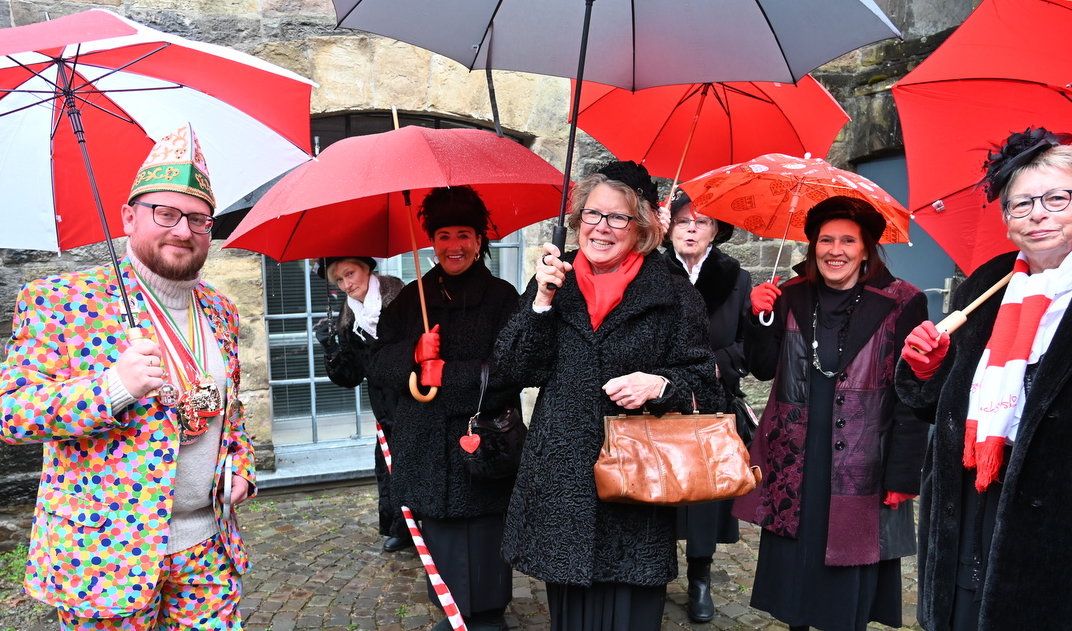 Auf dem Engelsplatz hatten sich pünktlich etliche kostümierte Karnevalsbegeisterte eingefunden. Teils bestens mit Pavillons oder Schirmen ausgestattet. Denn das Wetter war heute so gar nicht in Karnevalsstimmung. Rasch war auch die Schlüsselübergabe erledigt, gerne übergab der erst wenige Monate im Amt tätige Rathauschef für die tollen Tage seine Macht. Nach einer kurzen, im Reimform dargebrachten Erklärung und dem obligatorischen Schnäpschen vom Bürgermeister, folgte der Tanz der Möhnen. Aufgrund des tosenden Applaus war eine Zugabe die logische Folge. Moderiert von Reinhold Müller und Daniel Technow, unterstützt durch Vertreter der beiden Geldinstitute der Gemeinde, zogen das Kinderdreigestirn der Närrischen Oberberger sowie die Prinzenpaare aus Ründeroth und Engelskirchen auf und sorgten mit ihren Sessionsliedchen für Schunkelstimmung.