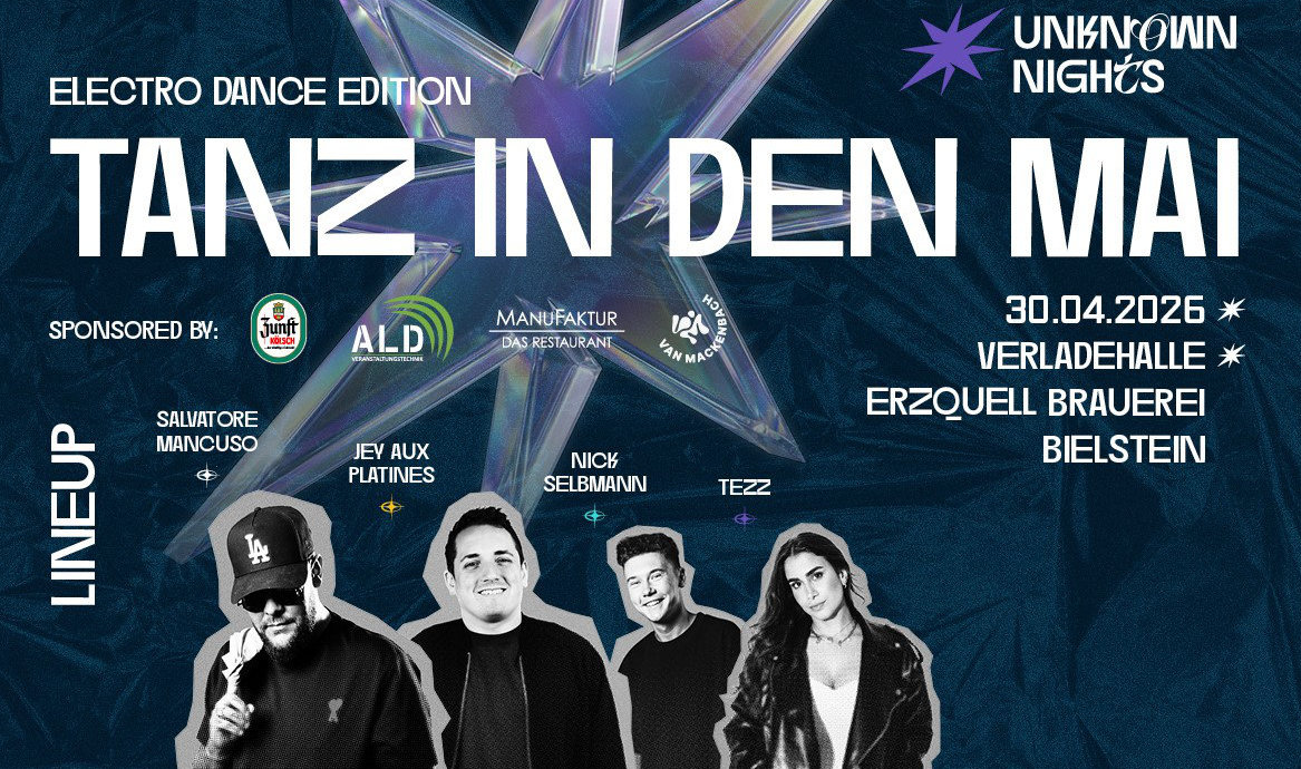 Wiehl - Am 30. April verwandelt sich die Ladehalle der Erzquell Brauerei in Bielstein in eine eindrucksvolle Eventlocation für Liebhaber elektronischer Musik. Unter dem Titel „Tanz in den Mai – Electronic Dance Edition“ lädt das Eventformat „unknown nights“ zu einer energiegeladenen Nacht voller Beats und besonderer Atmosphäre ein.