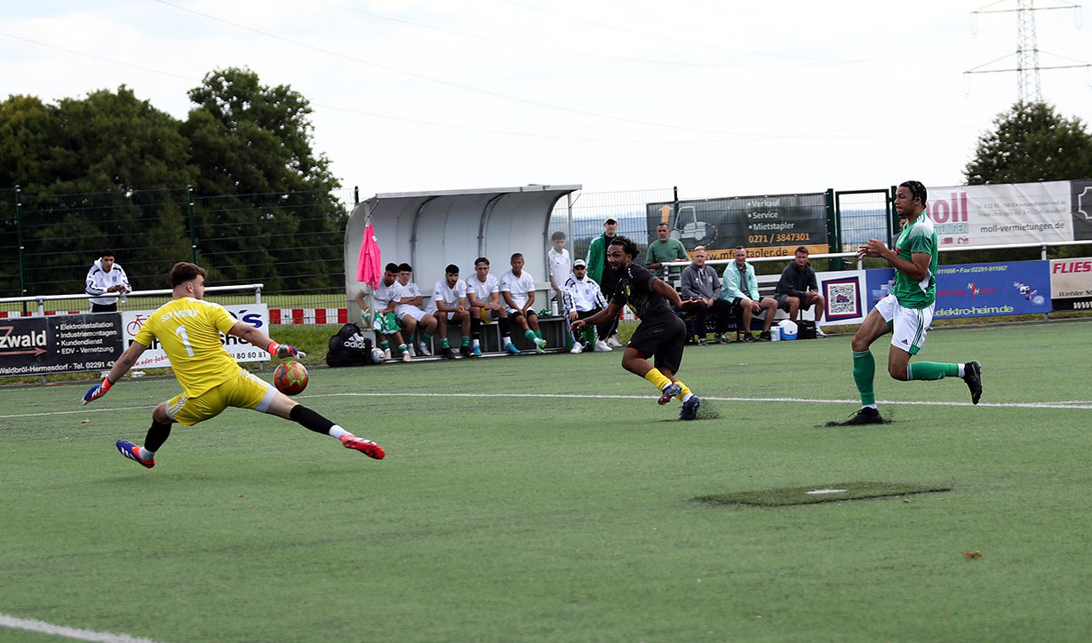 Die Hohkeppeler haben sich ein bisschen den Frust von der Seele geschossen. Nach unruhigen Wochen und dem Rücktritt des gerade erst engagierten Trainers Pablo Gonzalez-Huerta zeigte sich der Gast in guter Form und dominierte den Bezirksligisten von der ersten Minute an. Hochkarätige Torchancen blieben zunächst aus. Hohkeppel versuchte häufig über die rechte Offensivseite zu attackieren und suchte Rudolf Gonzalez, der immer wieder mit Dribblings und gefährlichen Vorstößen für Unruhe beim Gegner sorgte und mit seinem Tor zum 0:1 den Bann brach. Ufumwen Osawe erhöhte mit seinem Doppelpack, jeweils nach Vorarbeit von Gonzalez, bis zur Pause auf 0:3 und der Favorit sah schon wie der sichere Sieger aus.