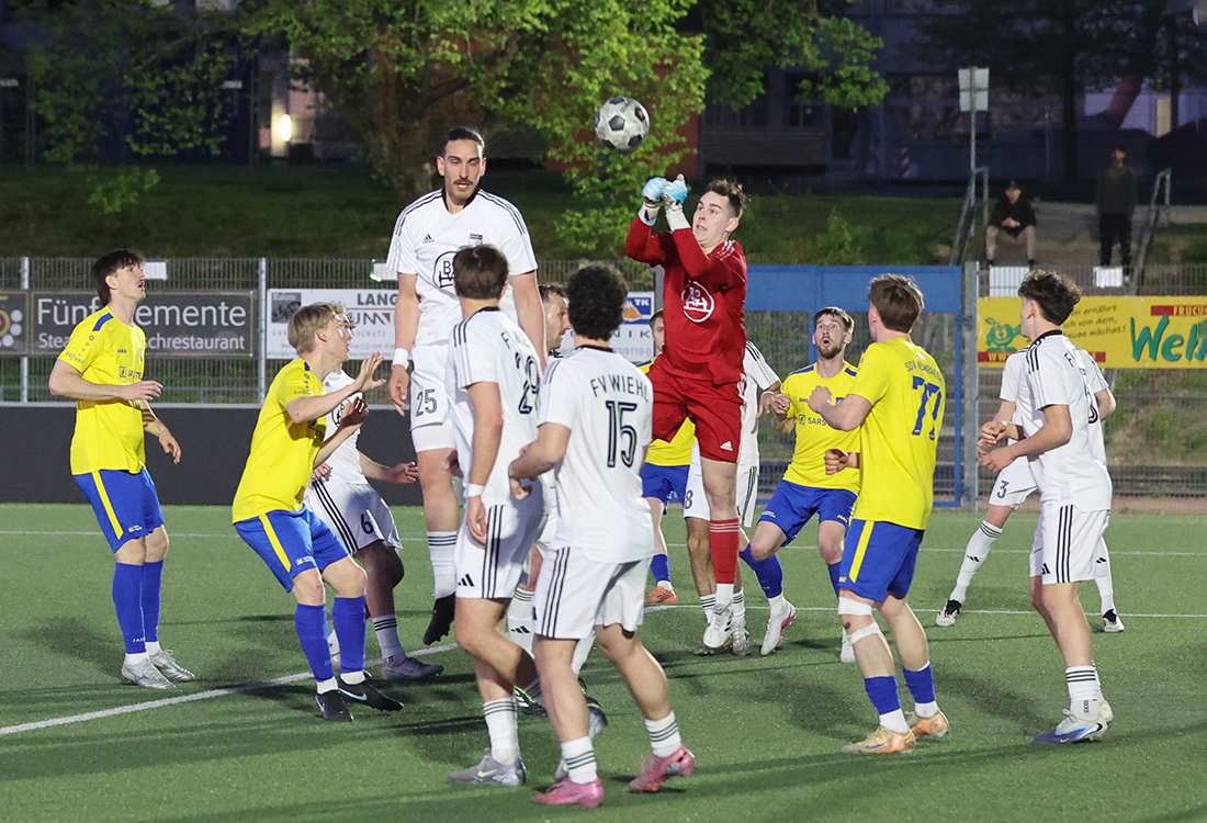 Kurz nach Wiederanpfiff schlugen die Nümbrechter dann eiskalt zu: Nach einem Ballverlust der Wiehler trat Nümbrechts Felix Klein den Ball scharf in die Mitte, wo Dennis Kania sich energisch durchsetzte und das Leder zum 1:0 in die Maschen drückte (107.). Damit begann die spannendste Phase der Partie, in der die Wiehler nur sechs Minuten später die Chance zum Ausgleich bekamen. Kania foulte Justus Dabringhausen im Strafraum und es hieß Elfmeter für Wiehl. Den Strafstoß von FV-Innenverteidiger Ali-Can Gültekin fischte Nümbrechts Torwart Matteo Tessarolo jedoch glänzend aus dem rechten unteren Eck und bewahrte sein Team damit vor dem drohenden Elfmeterschießen. Die Wiehler drängten zwar weiter auf den Ausgleich, doch sämtliche Versuche wurden von den Hausherren abgeblockt.