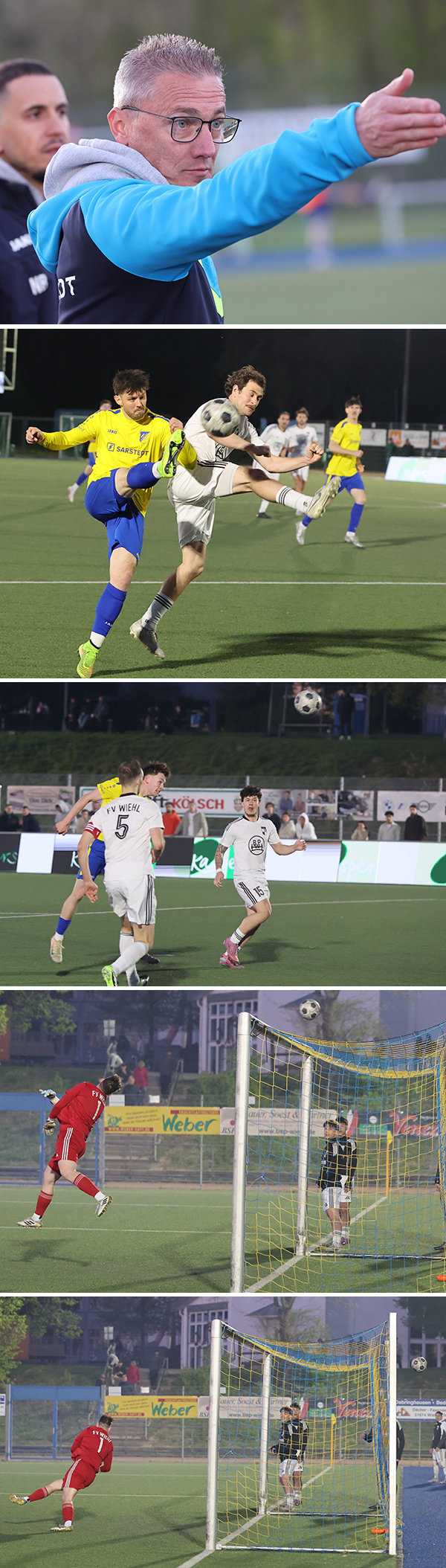 [Nümbrechts Trainer Marcus Voike war nicht immer zufrieden mit seiner Mannschaft ( von oben). Dennis Kania gelang der Siegtreffer. Wiehls Torwart Justin Broy parierte zwischenzeitlich einen Kopfball von Nümbrechts Felix Klein.]