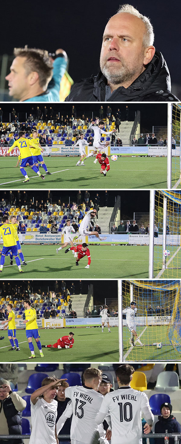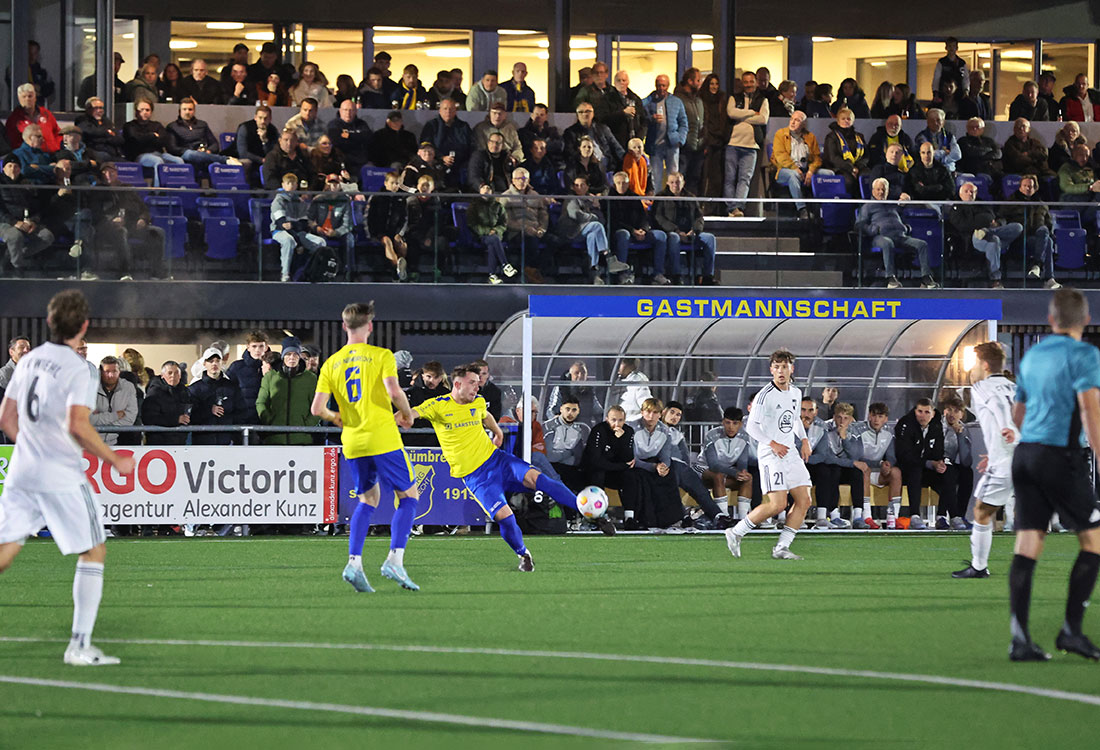 Vor der stolzen Kulisse von 1.038 Zuschauern hatte Blau-Gelb den besseren Start erwischt. FV-Keeper Maximilian Vollmer wehrte einen Aufsetzer von Dean-Robin Paes ab und war gegen Niklas Goße auf dem Posten (3., 8.). Nachdem Paes den besser postierten Niklas Clemens übersehen hatte (9.), fanden die erstmals in einem 4-4-2 agierenden Wiehler besser in Begegnung. Justus Dabringhausen wurde beim Abschluss bedrängt und scheiterte an Matteo Tessarolo (13.), Jan Krieger zielte knapp vorbei (21.).