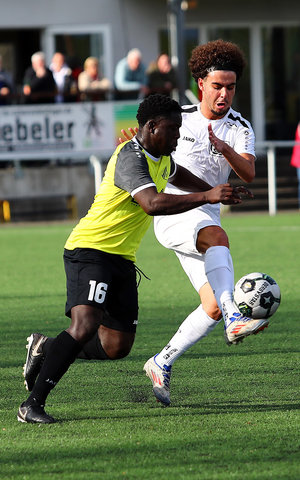 [Mohamed Loum im Zweikampf mit dem Niehler Erik Velaj.]
