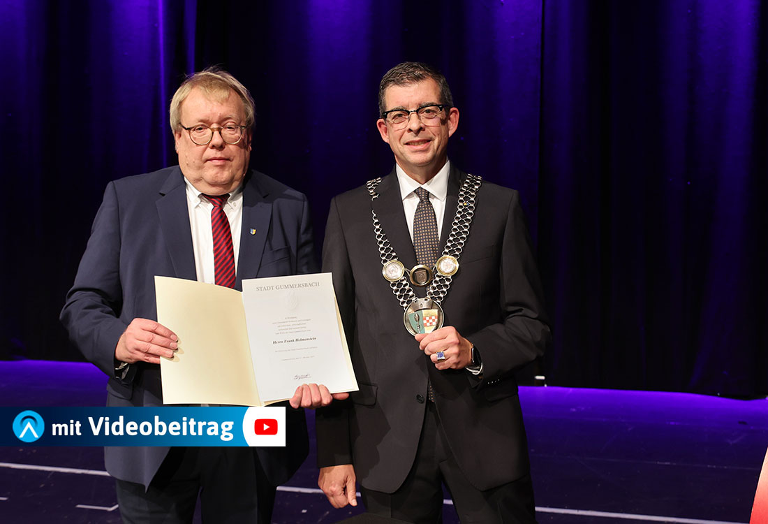 Im Anschluss wurde dem Bürgermeister in Würdigung seiner besonderen Verdienste und Leistungen auf dem politischen, wirtschaftlichen, kulturellen und sozialen Gebiet der Ehrenring der Stadt Gummersbach, die zweithöchste Auszeichnung der Kreisstadt, verliehen. Überreicht wurde sie ihm von seinem Stellvertreter Jürgen Marquardt. Im Anschluss trug sich Frank Helmenstein zudem in das Goldene Buch der Stadt ein. Er werde den Bürgern Gummersbachs nie vergessen, dass sie ihm die Geschicke der Stadt in herausfordernden Zeiten übergeben haben, sagte Helmenstein, der den Tag seinen verstorbenen Eltern widmete.