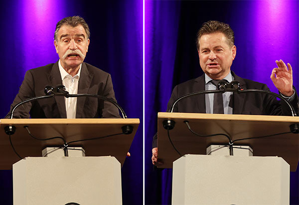 Viele lobende Worte fand in der Halle 32 auch ein weiterer Freund Helmensteins, Handballlegende Heiner Brand. Der ehemalige Bundestrainer sprach davon, dass Helmenstein mit dem angestoßenen Transformationsprozess nicht nur Fußstapfen, sondern ganze Fundamente hinterlassen habe und damit allerhöchsten Respekt verdient habe. Gleichzeitig berichtete er auch mit einem Augenzwinkern, warum die beiden in Harmonie jedes Spiel des VfL Gummersbach verfolgen können. Ihr Erfolgsgeheimnis laut Brand: „Während ich konzentriert jedes Spiel geguckt habe, ruhten deine Augen auf Handydisplay.“ Seine Laudatio beendete Brand mit einem ‚Danke‘ für Helmensteins Leistungen.