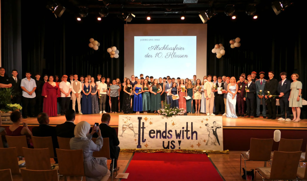 Mitgestaltet wurde das Programm durch musikalische Beiträge, einen Sketch der Klassenlehrer und Klassenlehrerinnen über bewegende Momente der nun zu Ende gehenden Schulzeit sowie humorvolle „Ehrungen“ durch die Schülerinnen und Schüler für Lehrkräfte mit „herausragenden Eigenschaften“. Bürgermeister Jörg Bukowski und Engelbert hoben in ihren Grußworten die Begabungen und Talente der jungen Leute hervor und wünschten ihnen für ihre weitere Ausbildung und ihren Lebensweg viel Erfolg und alles Gute. Im Anschluss an die Zeugnisvergabe präsentierten die Zehntklässler ihr Können beim Tanzen als Ergebnis durch die Ausbildung durch Tanzlehrer Fabian Schuster.