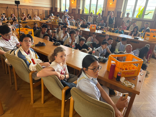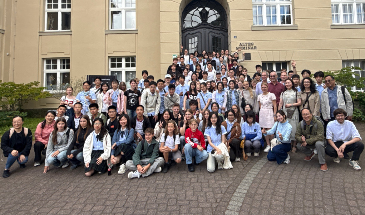 58 Schüler und acht Lehrer aus den chinesischen Städten Shanghai und Nanjing weilen derzeit im Oberbergischen Kreis. Heute wurden sie von Wipperfürths Kämmerer Jens Groll, in Vertretung von Bürgermeisterin Anne Loth, im Alten Seminar des Engelbert-von-Berg-Gymnasiums (EvB) empfangen und erhielten dort eine Unterrichtsstunde zur lokalen Geschichte der Hansestadt.