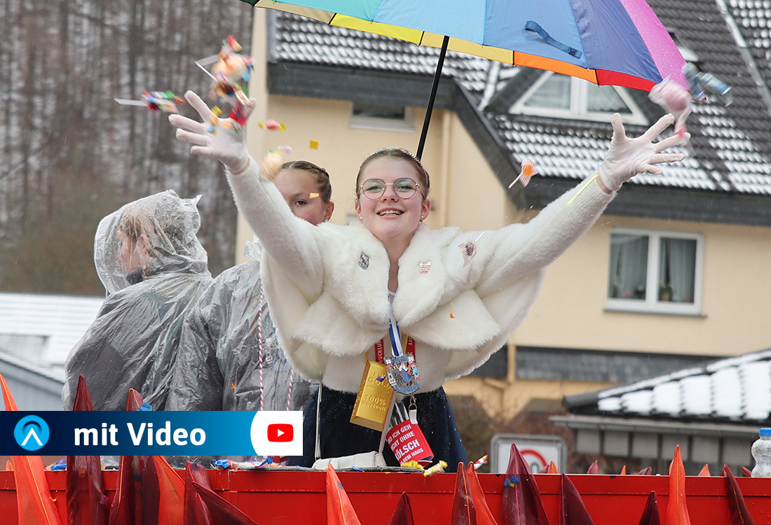Es sei eine „tolle Session“ gewesen, betonte die Prinzessin kurz vor dem Start des Zuges. Entsprechend stolz war auch ihr Vater: „Es gab durchweg positives Feedback aus allen KG's. Natürlich war das für alle die Frage im Vorfeld, dass eine 13-Jährige Prinzessin wird, aber ich glaube, keiner hat es bereut.“ Die Schülerin wurde auf ihrem Mottowagen, der von ihrer Mutter Jasmin Bukowski entworfen wurde und in den zahlreiche Stunden an Arbeit geflossen waren, von ihren Adjutantinnen Maira Hombach und Victoria Bolte begleitet. Sie sorgten trotz des schlechten Wetters für viel gute Laune und warfen von ihrem Turm reichlich Kamelle unters Volk. Für die Karnevalisten ging es im Anschluss an den Zug weiter ins Festzelt. Auch morgen stehen für Prinzessin Liya I. noch vier Auftritte an.