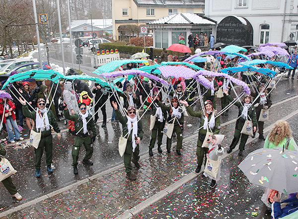 Kalt, windig und nass: Doch getreu dem norwegischen Sprichwort „Es gibt kein schlechtes Wetter, nur schlechte Kleidung“ feierten trotzdem tausende Jecken in Morsbach den Rosenmontagszug. Bis zur Halbzeit schien der Wunsch von Prinzessin Liya I. aus dem Hause Bukowski nach trockenem Wetter noch in Erfüllung zu gehen. Als der Zug sich gegen 13:11 Uhr in Bewegung setzte, herrschte tatsächlich noch strahlender Sonnenschein über der Republik, von Westen näherten sich allerdings bereits dunkle Wolken. Nachdem etwa die Hälfte der insgesamt 55 Fußgruppen, 31 Mottowagen und drei Musikvereine das Zentrum in Morsbach am Kreisverkehr passiert hatte, öffnete Wettergott Petrus dann auch seine Schleusen und machte Regencape und Regenschirm zur Pflicht für jeden Karnevalisten.