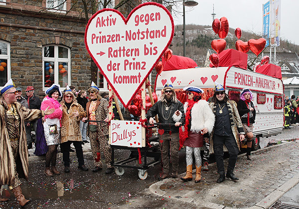 Diejenigen, die gekommen waren, erlebten dafür einen 'Zoch', der auch in diesem Jahr wieder bunt, laut und (lokal)politisch angehaucht war. Kreativ und frivol nahmen „Die Dullys“ die diesjährige Tollitätensuche der KG Morsbach aufs Korn. Unter dem Motto „Aktiv gegen den Prinzen-Notstand → Rattern bis der Arzt kommt“ hatte die Gruppe ihren Wagen in ein durchweg wackelndes „Lovemobil“ mit dem Namen „Prinzen-Manufaktur - Do et für Mueschbech“ verwandelt und waren als Bordsteinschwalben unterwegs, die immer wieder männliche Passanten in ihren Wohnwagen locken wollten.