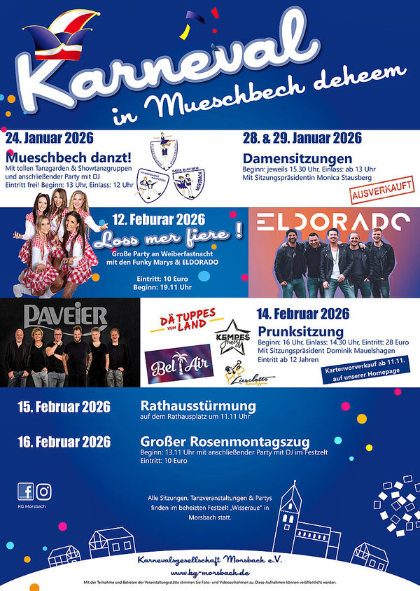 Zur Party an Weiberfastnacht, 12. Februar, darf die KG mit „Eldorado“ und den „Funky Marys“ erneut bekannte Gäste direkt aus der Domstadt begrüßen. Für die große Prunksitzung am Samstag, 14. Februar, sind nur noch wenige Restkarten erhältlich. Unter anderem haben sich die „Paveier“ angekündigt.