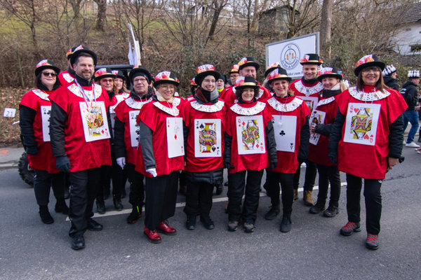 Das Rathausteam mischte sich als Casino- Glückritter, unter dem Motto „die Karten sind neu gemischt“ unters Volk. Mit dabei erstmals Neu-Bürgermeister Jan Gutowski, der bisher als Bundespolizist „schwere Dienste“ im Kölner Karneval zu leisten hatte. Die daraus resultierende Überzeugung „nie mehr Fastelovend“ habe sich allerdings mit der neuen beruflichen Erfahrung ins komplette Gegenteil verkehrt und wurde seinerseits ab sofort um den Zusatz „ohne mich“ ergänzt. Das imposante Finale des eindrucksvollen Karnevalszuges tauchten die Burgmäuse, die Pänz von der Burg, die Burggarde, Senat, Elferrat, Jecken und nicht zuletzt das Denklinger Prinzenpaar Robin I. und Prinzessin Lisa in einen rot-weißen Farbenrausch.