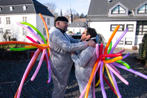[„Es muss ja nicht immer was Gekauftes sein“. Die Idee zum karnevalistischen Gesamtkunstwerk hatte Beate gegen 11 Uhr heute Morgen, nach einer halben Stunde war die Kreation fertig und dann ging's ab zu Fuß zum Zoch nach Denklingen.]