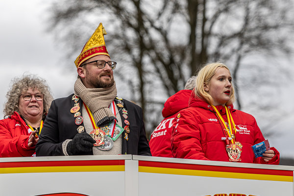 Etwas ganz Besonderes war der Zug natürlich für das Prinzenpaar Norman (Becker) I. und seine Prinzessin Melanie. Die vergangenen Tage seien schon nicht arm an Höhepunkten gewesen, sagten die beiden kurz vor Beginn des Zugs um 14:11 Uhr an der Jagdhütte. Die Kostümsitzung sei fantastisch gewesen, Weiberfastnacht ebenso. Am Samstag beim Abschlussabend sei es schon sehr emotional geworden. Jetzt, vor dem großen Zug, seien sie aber doch nochmal „sehr aufgeregt“. Dabei durften sie auf die Unterstützung ihrer drei Kinder zählen. Der fünfjährige Lennox fuhr ebenso auf dem Wagen mit wie ihre Töchter Leonie (13) und Letizia (12). Ihre beiden „persönlichen Mariechen“ sorgten für die Musik. „Da haben wir nichts zu sagen“, sagte Melanie mit einem Lachen.