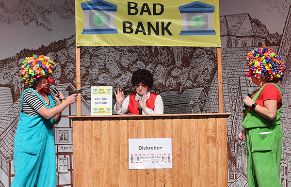 Einen Banküberfall (Foto oben) der besonderen Art erlebt das Publikum im nächsen Stück. Die vermeintlichen Räuber merken schnell, dass der Bankmitarbeiter selbst in höchster Finanznot ist. Das bringt die Räuber schließlich dazu, ihm das erbeutete Geld zu überlassen. Als der Kassierer schließlich für den zehnten Geldsegen in Folge geehrt wird, sind die Lacher in der Aula besonders laut. Im Laufe des bunten Nachmittags folgen aber auch reale Auszeichnungen. Für 40 Jahre KfD-Mitgliedschaft wurde Anette Lüdenbach geehrt und seit 30 Jahren ist Elke Sassenhausen mit dabei.