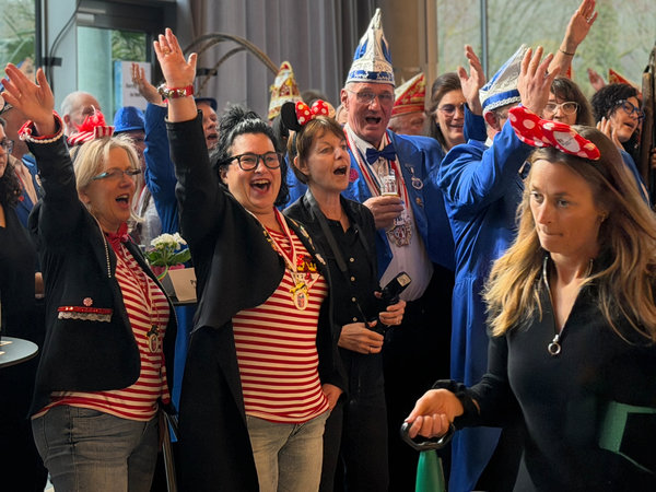 Zeit zum Üben hatte Grootens jedenfalls genug, war es gestern doch bereits die 28. Auflage der Traditionsveranstaltung, an der er schon etliche Male als Kreisdirektor teilgenommen hatte. Neben altbekannten Gesichtern gesellten sich auch neue Abordnungen unter das Jeckenvolk. So waren zum Beispiel Präsidentin Sandra Pillgramm und Adjutant Markus Murfuni von der Gummersbacher „Jeck Attack“ erstmals mit einer größeren Abordnung dabei. Die Kreismitte war genauso vertreten, wie Jecken aus Radevormwald und Morsbach. Andrea Eichler vom Landratsbüro hatte in diesem Jahr die federführende Organisation inne, buchte Catering und Saal und zeichnete auch für den Programmablauf verantwortlich.