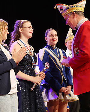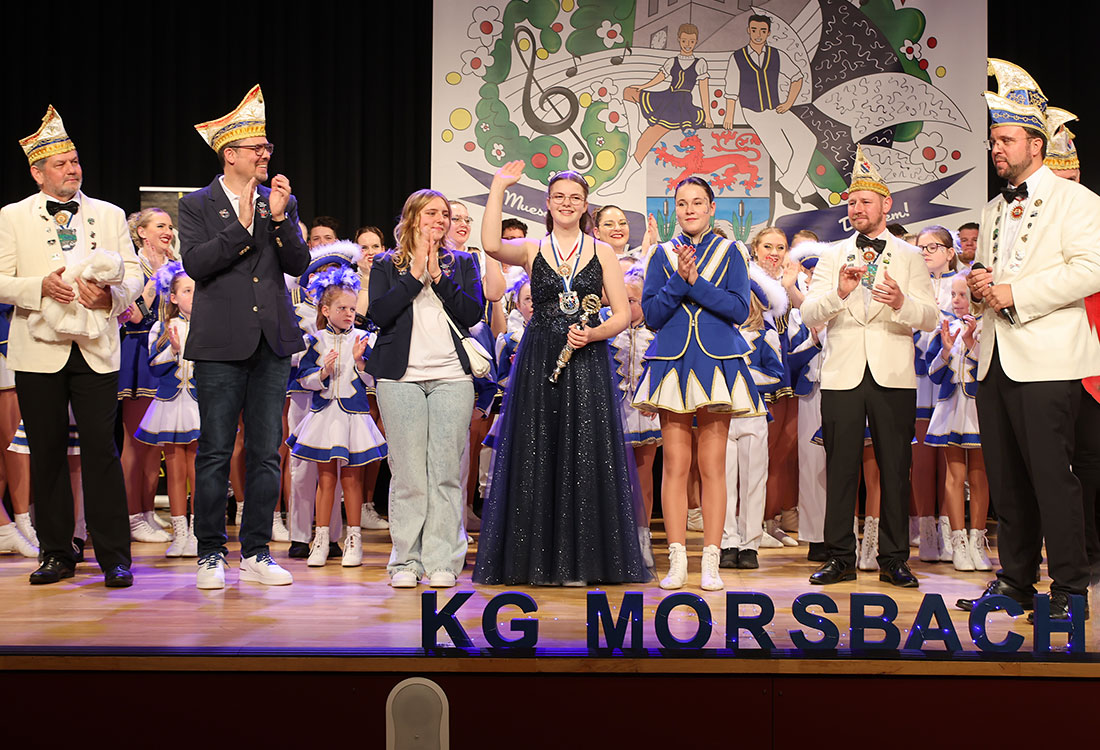 Nachdem sie ihr Sessionslied von der Karnevalsmaus tanzend und mit Unterstützung der Garden vorgetragen hatte, ergriff Prinzessin Liya I. das Wort, gab ihr Motto zum Besten und schilderte, wie ihr Weg sie über die Kindergarde und die Garde Blau-weiß bis zur jüngsten Prinzessin des Vereins geführt habe. Nunmehr in Amt und Würden, übergab sie die ersten Orden, so auch an Ehrengäste wie Wolfgang Köckerling und Kai Gissinger vom Regionalverband Oberberg des Bundes der Karnevalisten und den neuen Bürgermeister Morsbachs Jan Schumacher. Schumacher verwies in seinen Dankesworten auf den Umstand, dass er sicherlich in die Geschichte Morsbachs als erster Bürgermeister eingehen würde, der die Rathausschlüssel vom Vater übergeben bekommen hatte und von der Tochter an Weiberfastnacht wieder abgenommen bekam. Für diese launigen Worte erhielt er Applaus vom lachenden Publikum.