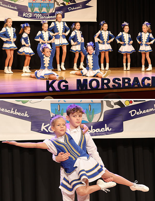 Freudestrahlend und mit musikalischer Untermalung von „Steh auf – mach laut“ marschierten die drei Gardetanzgruppen der KG Morsbach in die vollbesetzte Kulturstätte in Morsbach ein, wo sie auf der Bühne vom Moderatorenduo Monica Stausberg und dem Sitzungspräsidenten Dominik Mauelshagen in Empfang genommen wurden. Mit den 14 Tänzerinnen und sieben Tanzoffizieren der Kindergarde gelang der KG ein fulminanter Einstieg in einen karnevalistischen Abend vom Feinsten. Besonders der Solotanz von Mats Stricker und Ellen Stausberg, die beide erst 2016 geboren wurden, führte zu Jubelbekundungen und spontanem Beifall im Publikum.