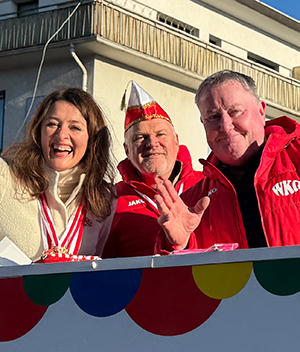 [Vom WKG- Prinzenwagen grüßten Waldbröls Bürgermeisterin Larissa Weber und die Karnevalshonoratioren.]