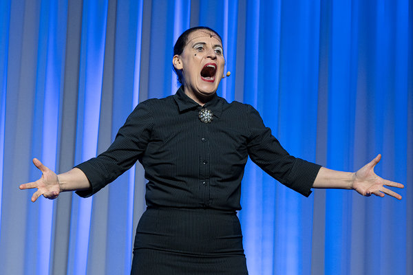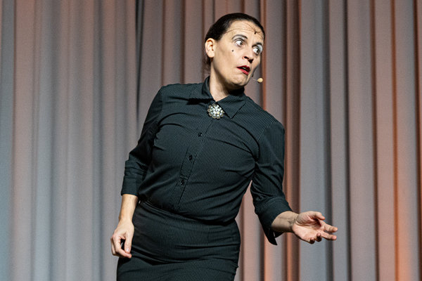 Im ausverkauften Stadtteilhaus Drabenderhöhe blickte „La Signora“ in ihrer Show „Froschkönigin“ auf 20 Jahre Bühnenkarriere zurück und zeigte als Showgirl ihr Jubiläumsprogramm wahlweise mit ihrem Akkordeon, verbal oder auch mal wild tanzend und hüpfend. Die italienischstämmige Carmela De Feo ist Musikerin, Sängerin und Comedian. In ihrer Rolle der „La Signora“ gibt sie ein singendes und Akkordeon spielendes „Italo-Ruhrpott-Weib auf Männersuche“ und das seit 2006, also mittlerweile 20 Jahre – und das, wie sie sagte, „ganz ohne Sexskandale“. Ob es an ihrem Erscheinungsbild ganz in Schwarz und mit Haarnetz liegt? Auf alle Fälle sind es bisher 20 Jahre Lachen mit La Signora … bis der Prinz kütt.