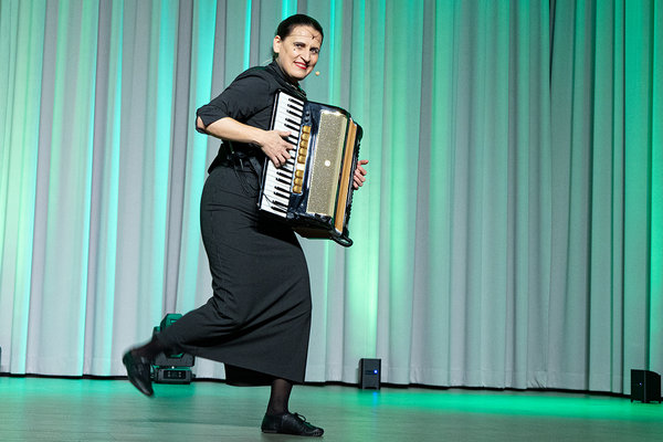 Im Rückblick auf 20 Jahre erzählte sie, dass sie am Anfang in jedem Kaff gespielt habe – auch in Wiehl. Als Froschkönigin sei sie Königin einer Pfütze und habe sogar ein Lied dazu mit viel Hüpfaktion und Hüftschwung dabei. Sie sei 20 Jahre Showgirl auf der Bühne mit dem Instrument des Jahres, dem Akkordeon. Das sei nicht auf der schwarzen Liste der Orchesterinstrumente wie die Tuba oder das des holländischen Kastraten mit dem Eierschneider.