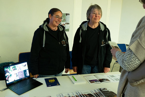 [Sandra Strunk (li.) und Hildegard Kramer erzählten an ihrem Infotisch über den Therapiestall Gummersbach, der pferdgestützte Pädagogik, Physiotherapie, Psychotherapie und Westernreitunterricht mit erfahrenen Pferden und Trainern bietet und ein Drittel aus dem Erlös des Charity-Konzertes erhalten wird.]