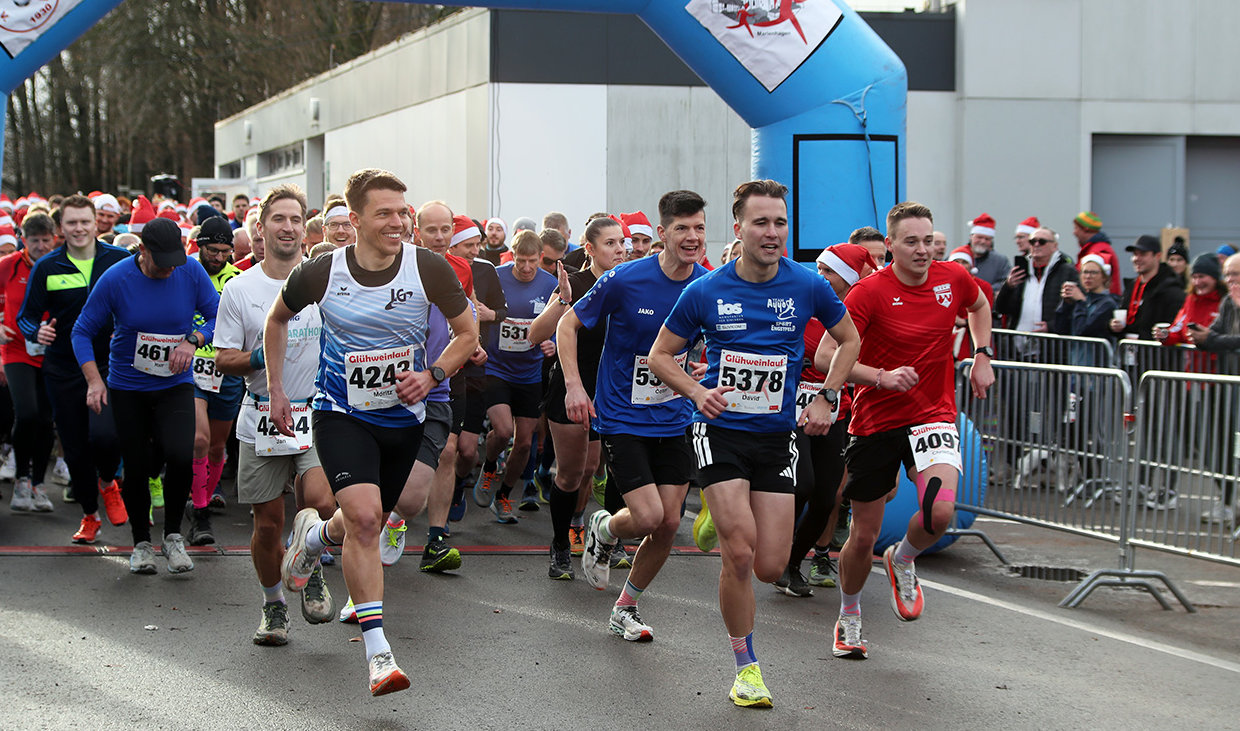 Wer sich am ersten Adventswochenende sportlich betätigen und dabei noch den einen oder anderen Glühwein genießen möchte, ist in Marienhagen an der richtigen Adresse. Zum 13. Mal richtete der VfR Marienhagen seinen Glühweinlauf aus. Was einst aus einer „Schnapsidee“ entstanden war und mit knapp 300 Startern begonnen hatte, hat sich zu einem der größten Laufwettbewerbe der Region entwickelt. Bei der ersten Auflage nach der Corona-Zwangspause verzeichneten die Verantwortlichen 990 Starter, in diesem Jahr musste die Liste bei 1.500 Anmeldungen geschlossen werden, um alle behördlichen Vorgaben einzuhalten.