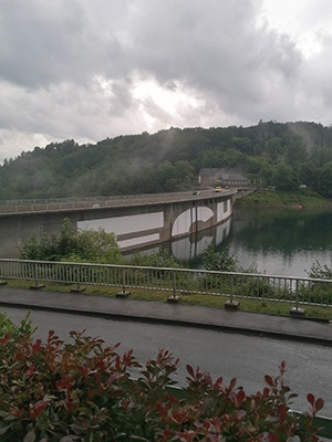 [Bei der Eröffnung hingen dunkle Wolken über der Aggertalsperre. Trotzdem war die Spiegelung immer mal wieder zu sehen.]