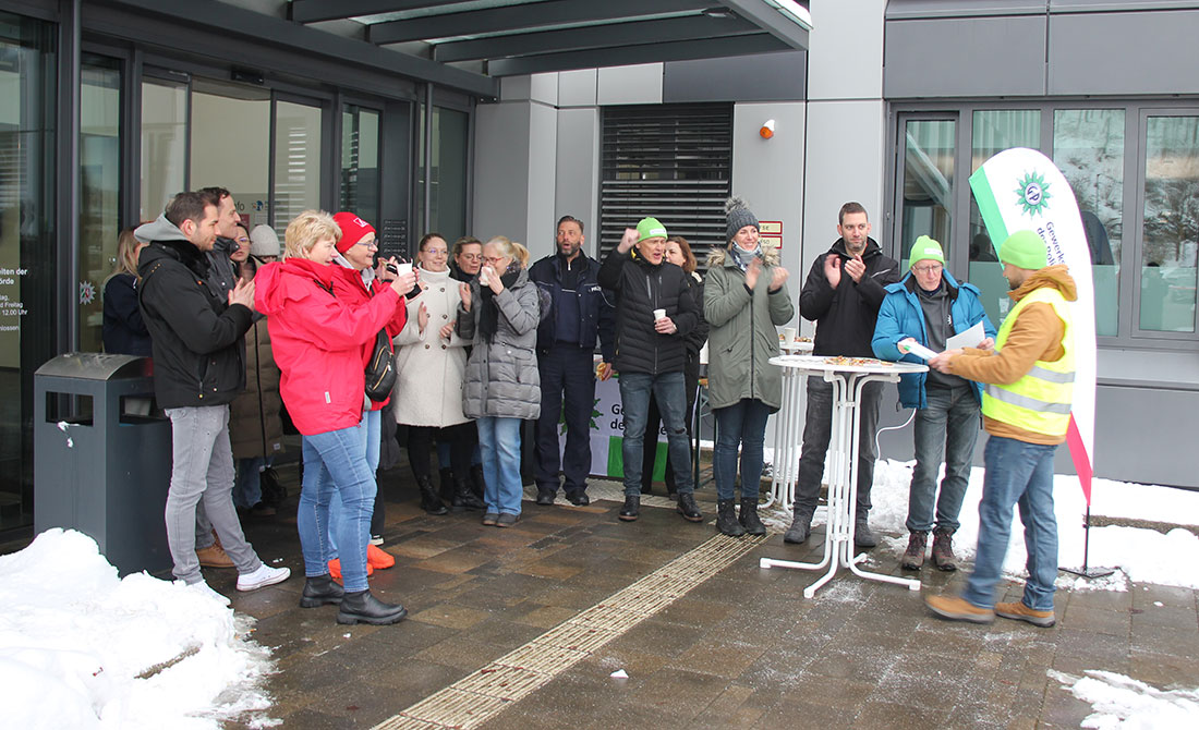 Anfang Dezember sind die Tarifverhandlungen im Öffentlichen Dienst auf Länderebene gestartet. Nachdem auf kommunaler und auf Bundesebene bereits Abschlüsse erzielt werden konnten, geht es nun um die laut Verdi mehr als 900.000 Tarifbeschäftigten im Öffentlichen Dienst der Länder. In der ersten Runde gab es nicht einmal ein Angebot der Tarifgemeinschaft deutscher Länder (TdL). Nun, kurz vor der zweiten Verhandlungsrunde am 15. und 16. Januar, hatte die Gewerkschaft der Polizei Oberberg ihre Landesbeamten zu einer angemeldeten „aktiven Mittagspause“ aufgerufen, um auf den Tarifkonflikt und die eigenen Forderungen und Bedürfnisse aufmerksam zu machen. Vor dem Polizeipräsidium in Gummersbach kamen rund 20 Kolleginnen und Kollegen zusammen, dazu hatte die IG Metall Gummersbach eine Abordnung geschickt, um sich solidarisch zu zeigen.