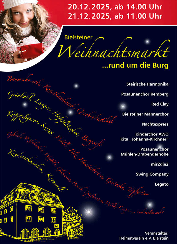Zum 16. Mal lädt der Heimatverein Bielstein zum "Bielsteiner Weihnachtsmarkt rund um die Burg“ in Bielstein ein. Die Veranstaltung findet am vierten Adventwochenende, Samstag und Sonntag, 20. und 21. Dezember statt. Die Besucher erwarten natürlich nicht nur die vielen kleinen Holzhütten, wo es leckeres Essen und Getränke sowie Handwerkliches und andere Geschenkideen geben wird.