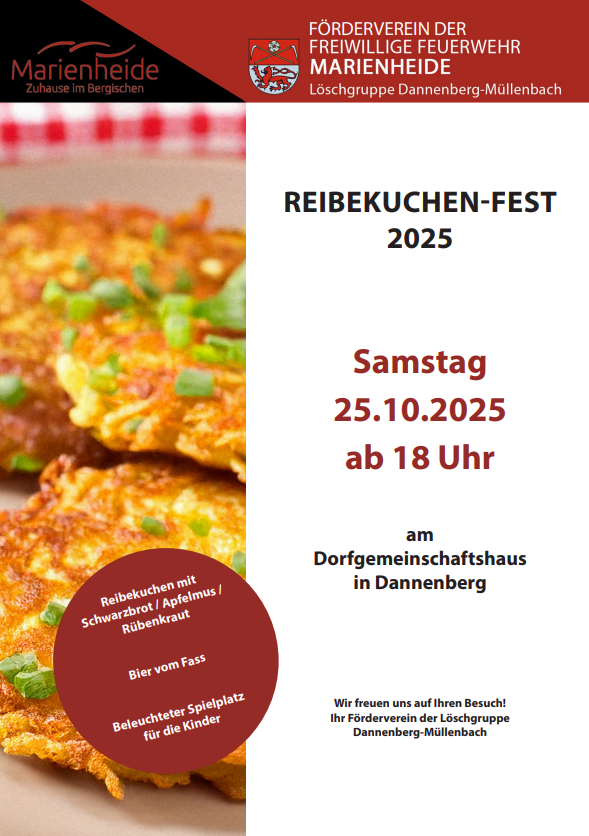 MARIENHEIDE Reibekuchenfest der Feuerwehr Dannenberg-Müllenbach TEILEN Red; 15.10.2025, 08:21 Uhr Marienheide - Fest findet am 25. Oktober statt. WERBUNG